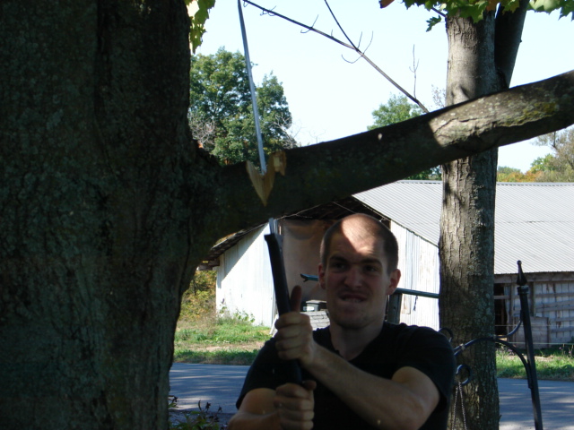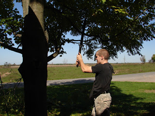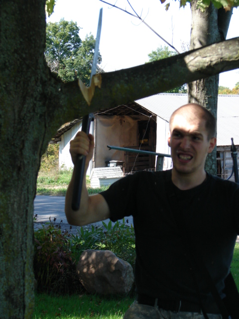 Rule number one: never stand on the branch that you are cutting. No, Matthew, you are not really a ninja!Matthew recently had a birthday and his good friend Brett gave him a katana as a gift. I did not know those things were so sharp!Some of the trees out front needed a bit of trimming. Katana + Matthew + trees that need trimming = Ninja tree trimmer!The facial expression is my favorite. Remind me to count fingers, toes, arms and legs when he is done -