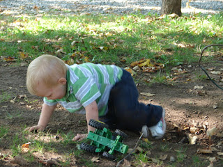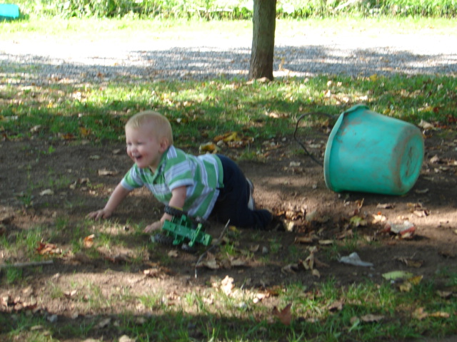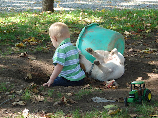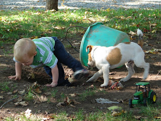 We have a hole in our back yard. We have always had a hole in our back yard. We also have boys and dogs. They go together don't you know. When there are no longer boys and dogs in this house there will no longer be a hole in the back yard.What is the hole for all you ladies may ask. I'll tell you, I don't know it just makes them happy to have a hole. Years ago I used to fill it in and they would dig it out. We played that game several times until my husband convinced me that a hole was a necessary ingredient to the raising of boys and dogs. So I gave up and just let it be.Must be true. There is Layn his first summer out here on his own and he gravitates to that hole like iron to a magnet, same as he does when it has rained and there are mud puddles out there. (but that is another post)Today I am thanking God that there is a hole in my back yard. Here I sit at the picnic table working on an essay for school and Layn and Archie have been happily occupied in that hole for a good 15 minutes. (that has to be a record!) -